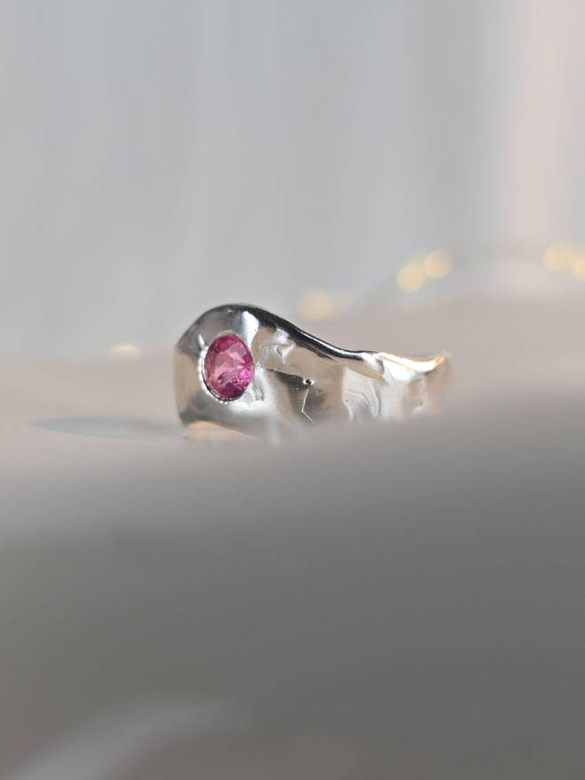 Mé šperky jsou kompletně ručně vyráběné z recyklovaných drahých kovů a pečlivě vybraných drahokamů. Zvláštní technika „tekoucího“ zpracování kovu vytváří výrazový jazyk, ve kterém tvrdý materiál nese otisk měkkosti a organického pohybu. Pracuji s jedinečnou technikou, při níž je roztavený kov vystaven kontrolovaným pohybům. Jakmile ztuhne, tyto pohyby se trvale zapisují do hmoty. Výsledkem jsou organické, spontánně formované a nereprodukovatelné originální kusy. Pevné struktury odhalují jemnou energii proudění a něhy. Svět značky je intuitivní, moderní a kosmický — dotýká se duše.