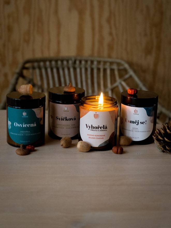 Jsme "Vyhořelá". Malá značka přírodních sojovo-kokosových svíček. Ale ne tak ledajakých. Naše svíčky jsou (z)lité s láskou a dávkou sarkasmu. Navíc s ohledem na životní prostředí - všechen materiál vyrábíme i nakupujeme v Česku. Obecně dbáme na znovuvyužívání. Naše „vínová edice“ vzniká ze seříznutých lahví od vína, které po dohoření poslouží jako skleničky. „Kávová edice“ je zas v keramických kalíšcích, ze kterých si později můžete vychutnat třeba espresso. Jsme Aneta a Terka – dvě holky, které se potkaly při studiu žurnalistiky, hrají si se slovy a svíčkám dávají (dů)vtipná jména.